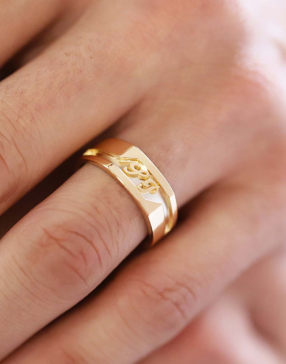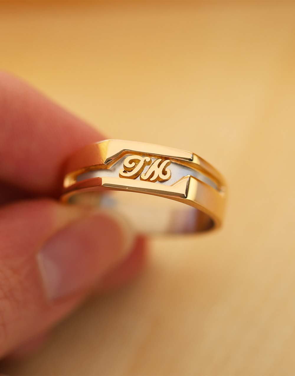 La bague moderne Mathis séduit par son design architectural et sa présence affirmée. Fabriquée à la main dans nos ateliers français, elle associe la chaleur de l’or jaune à l’éclat raffiné de l’or blanc. Son plateau rectangulaire de 7 x 10 mm affiche un style géométrique et épuré : un rectangle ajouré, rehaussé d’un long trait déstructuré en or blanc, encadre en son centre deux lettres soudées. Une création résolument contemporaine, à la fois graphique et élégante, qui affirme le goût du détail et du savoir-faire artisanal.