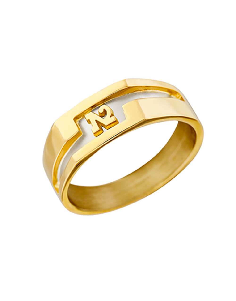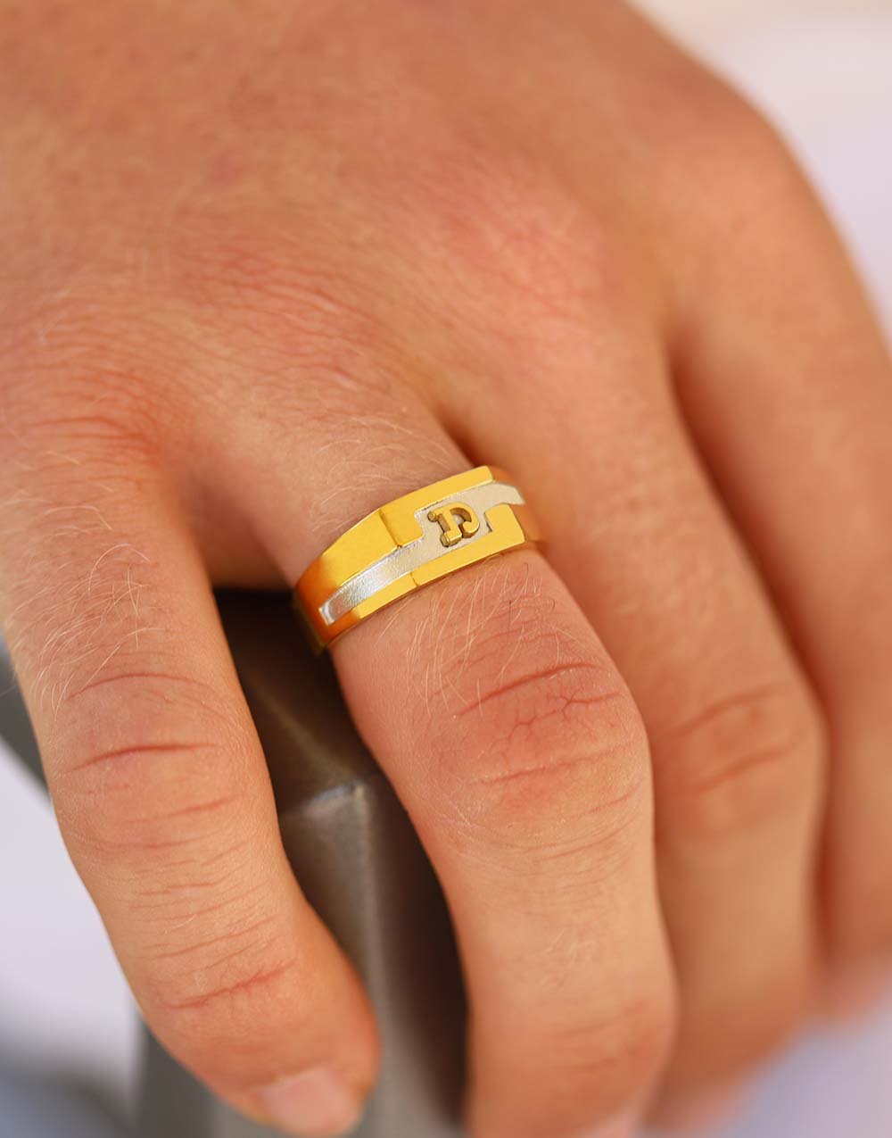 Cette bague moderne en or bicolore séduit par son design épuré et architectural. A travers son plateau rectangulaire de 7×10 mm, un trait ajouré en or blanc vient souligner une lettre personnalisée, soudée avec précision au centre. Le contraste entre l’or jaune et l’or blanc crée un jeu de lumière élégant et contemporain, à la fois masculin et raffiné. Son allure géométrique, inspirée d’un cadre photo minimaliste, en fait une pièce forte et originale, idéale pour un homme qui aime les bijoux au style affirmé.