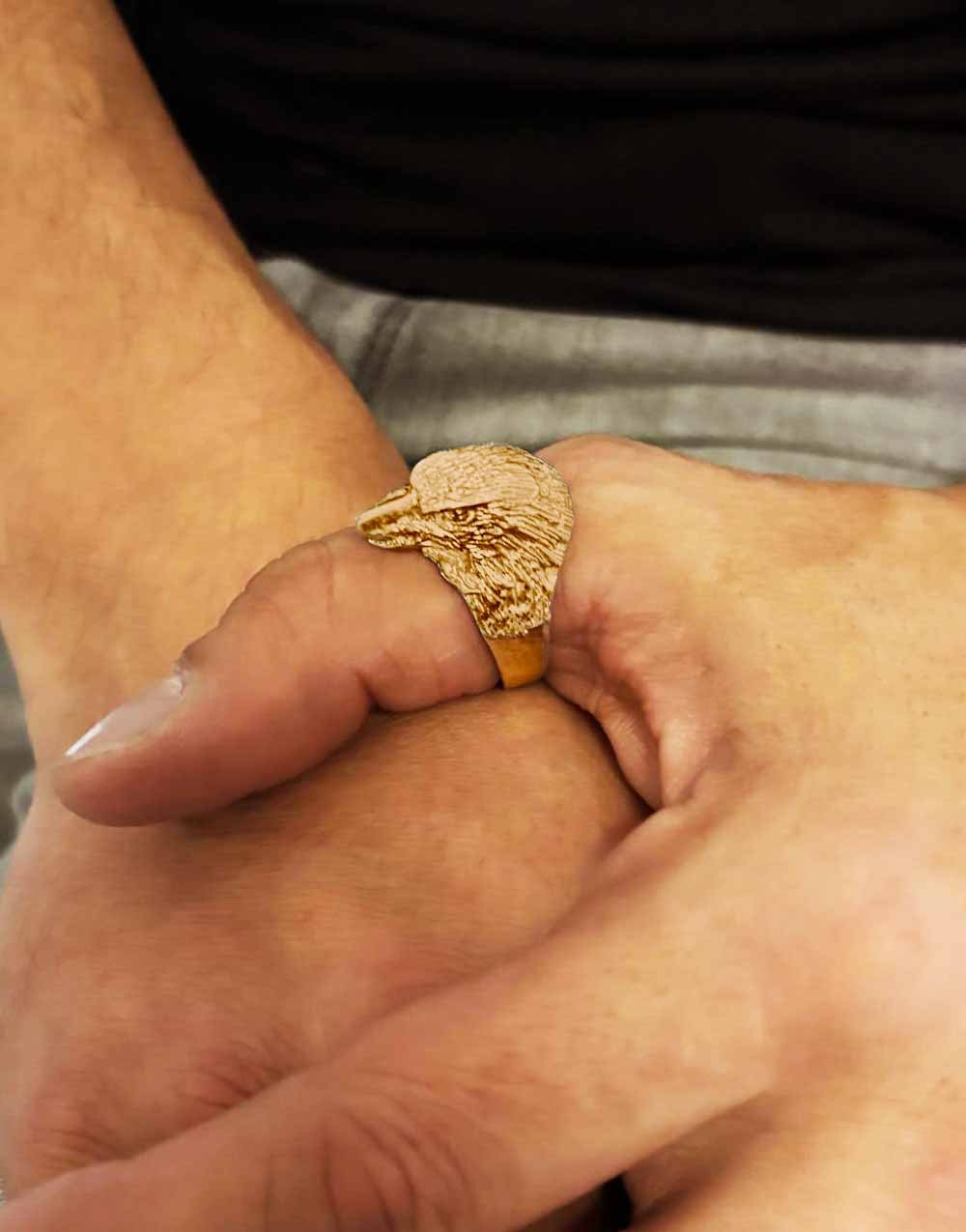 La Bague Tête d’Aigle en Or est une création unique qui incarne à la fois l’élégance et la force. Réalisée entièrement à la main dans nos ateliers français, cette bague reflète le savoir-faire de nos artisans bijoutiers, héritiers de techniques traditionnelles transmises de génération en génération. Avec son motif tête d’aigle en relief de 23/24 mm, elle capte la lumière et l’attention par la finesse du détail, du bec aux yeux, jusqu’aux plumes sculptées avec précision.