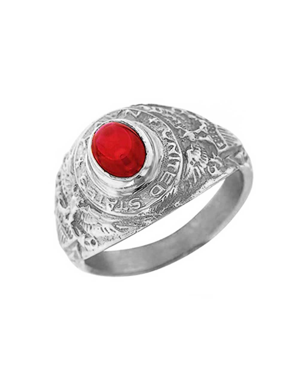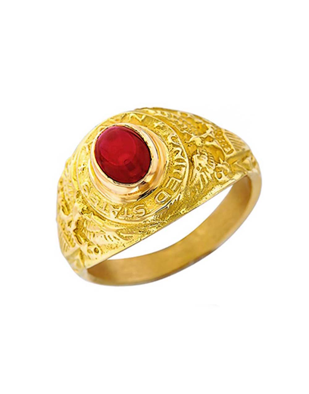 Sur cette bague américaine pour homme, deux aigles majestueux se déploient fièrement, semblant protéger une pierre Rhodolite d’un rouge profond, presque sang. Couronnée de l’inscription « United States Navy », cette création s’inspire des bagues militaires et universitaires qui symbolisent l’appartenance, la force et la réussite.
