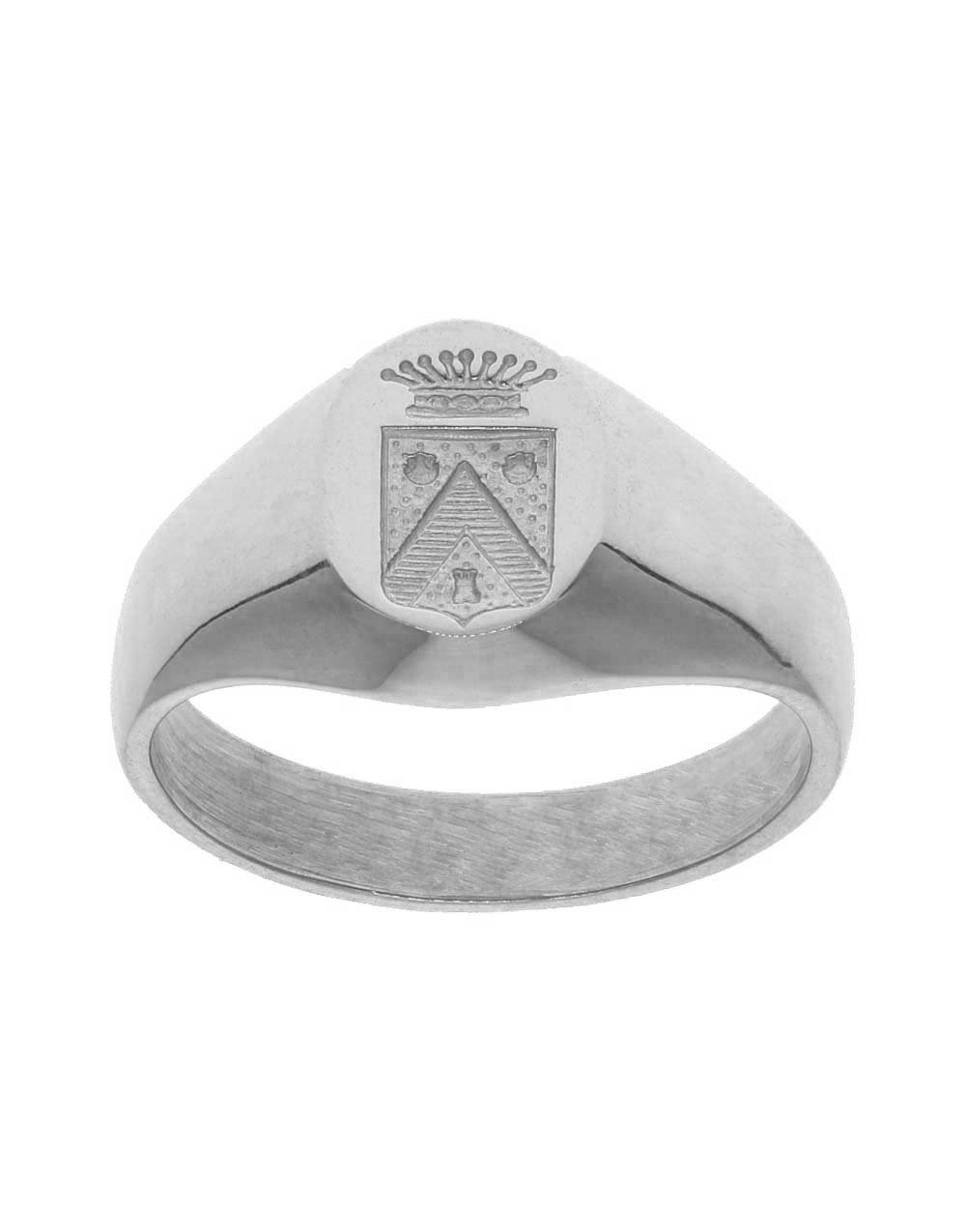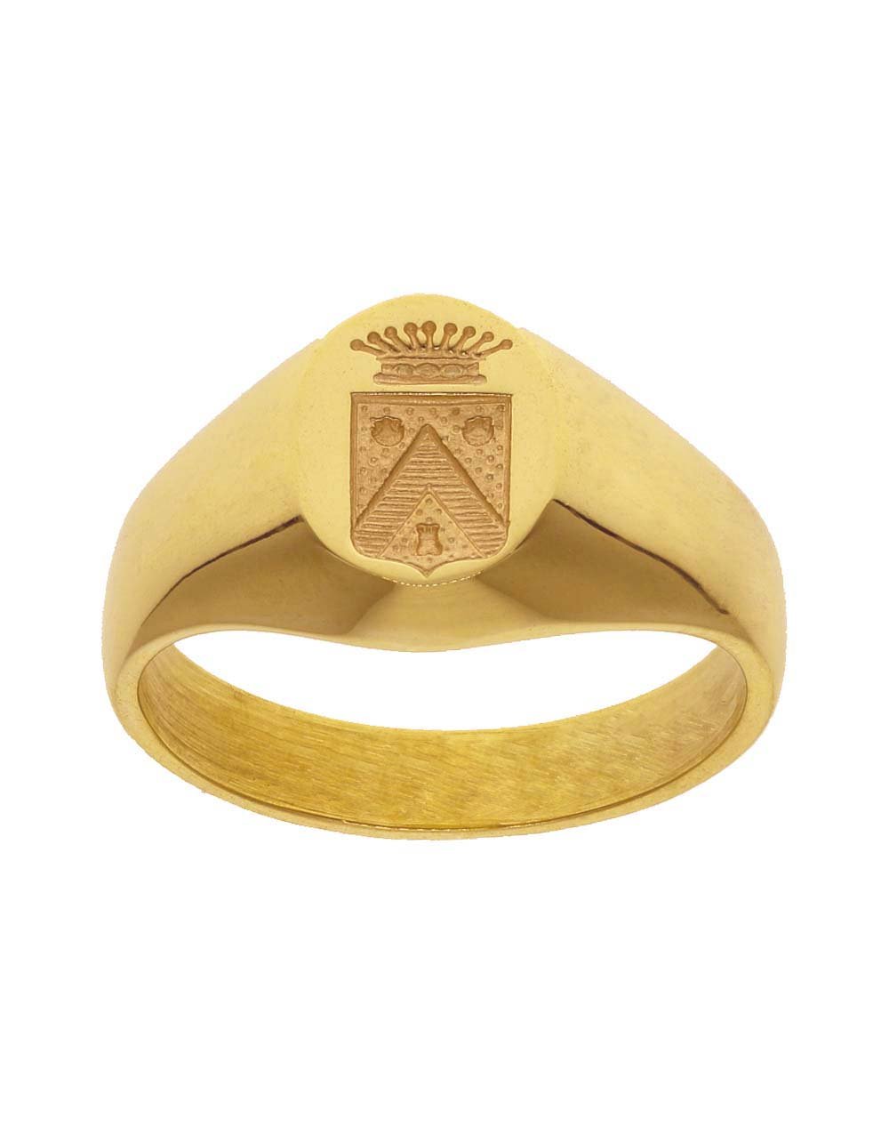 La chevalière blason Olivia allie élégance féminine et style héraldiques classique. Son plateau ovale de 10 x 8 mm, fort d’or mais délicat, présente un écu coupé par deux diagonales en forme de pyramide, surmonté de deux ronds et complété par un motif en parchemin en bas au milieu d’une deuxième pyramide, le tout surmonté d’une couronne.