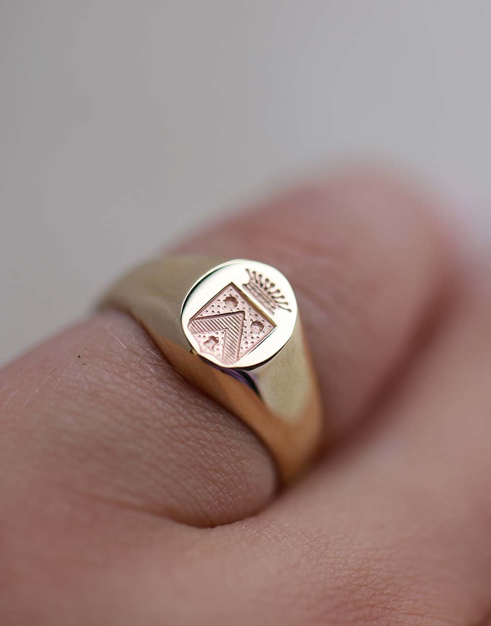 La chevalière femme Olivia peut être personnalisée par gravure intérieure, pour inscrire un prénom, une date ou un message. Fabriquée à la main en France, elle représente la maîtrise artisanale et la beauté intemporelle des chevalières blason, offrant un bijou unique pour chaque femme souhaitant allier style et tradition.