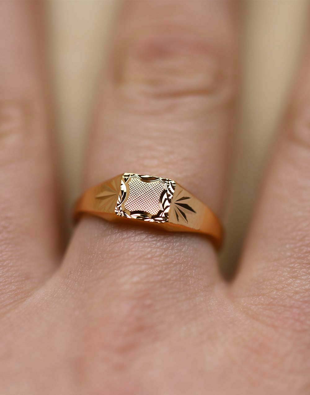 Fine et délicate, la chevalière carrée pour femme style Camille se distingue par son plateau de 6×6 mm finement quadrillé ou damier, offrant un subtil jeu de lumière et de textures. Le contour lapidé, travaillé comme un élégant rideau, encadre la bague avec finesse, tandis que deux étoiles gravées sur chaque flanc, façon godrons, apportent relief et éclat à l’ensemble.