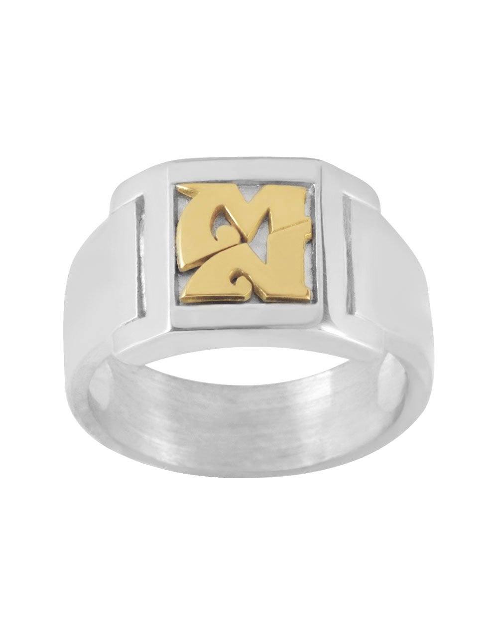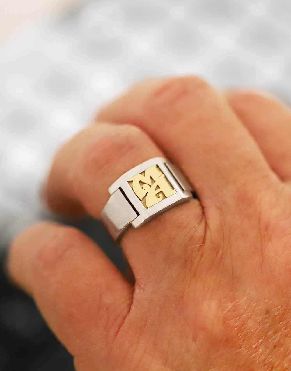Au centre du plateau, deux grandes initiales soudées s’imposent avec élégance. Elles sont mises en valeur par un encadré subtil, comme une vitrine dédiée à votre identité. Les surfaces brossées et polies jouent avec la lumière, révélant toute la profondeur du métal et la maîtrise du geste joaillier.