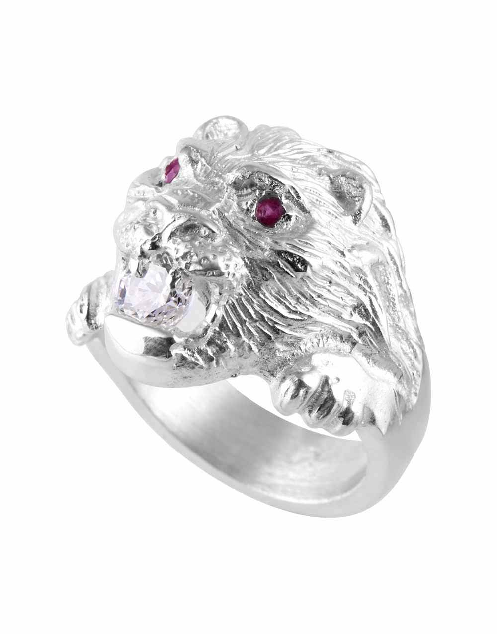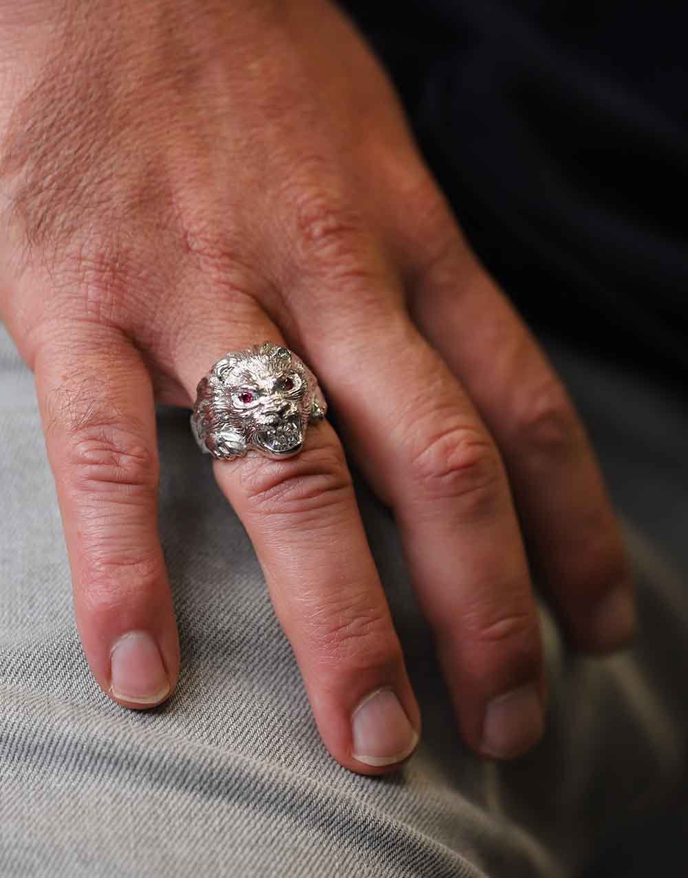 Le relief impressionnant de cette chevalière tête de lion témoigne d’un travail minutieux sur les formes et les ombres. La crinière, finement ciselée, capte la lumière et souligne chaque détail du visage royal de l’animal. Dans sa gueule, un oxyde de zirconium vient refléter la lumière tel un éclat brut, ajoutant une touche d’élégance contemporaine. Les yeux sertis de rubis rouges confèrent à cette pièce une intensité saisissante, symbole de courage, de passion et de protection.