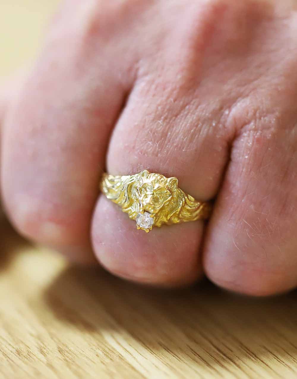 Façonnée en or jaune ou en or blanc, disponible en 9 carats ou 18 carats, cette chevalière séduit par la finesse de ses détails. Son motif tête de lion, sculpté dans la masse, dévoile une expression fière et majestueuse. Les crocs du lion s’entrouvrent pour laisser apparaître un oxyde de zirconium, une pierre synthétique éclatante qui capte la lumière avec intensité et ajoute une touche précieuse à ce modèle unique. Chaque relief, chaque texture est travaillée à la main pour restituer toute la puissance du roi des animaux.