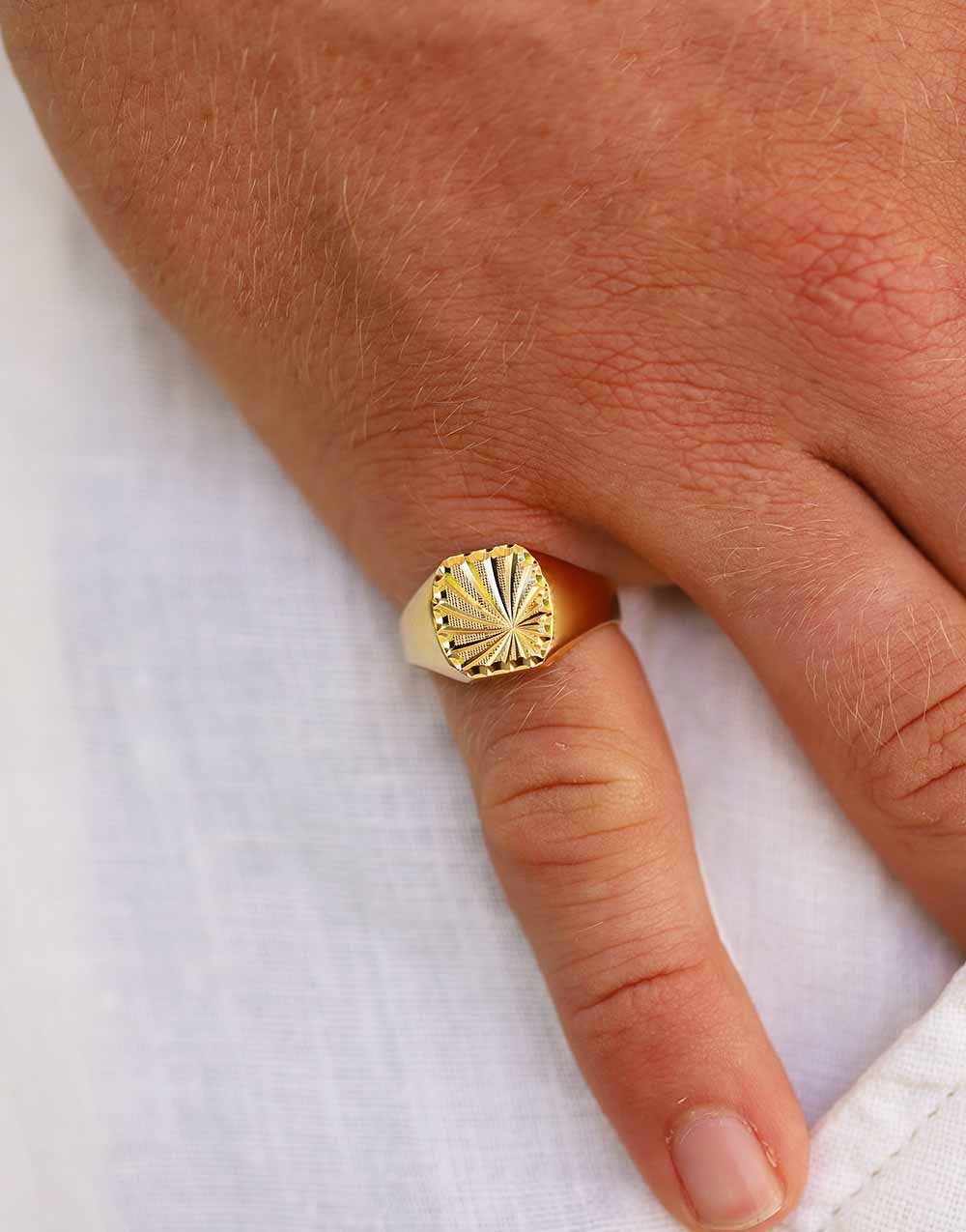 Le plateau tonneau de 12×11 mm de la chevalière Taylor Soleil Damier se distingue par son fond quadrillé, rappelant un damier délicat et donnant de la profondeur au bijou grâce à ses multiples traits fins. Le contour perlé apporte finesse et équilibre, tandis que le motif soleil lapidé, au centre, projette une multitude de rayons lumineux qui captent subtilement la lumière. Au cœur de ce soleil, une initiale soudée peut être ajoutée, pour personnaliser ce bijou d’exception.